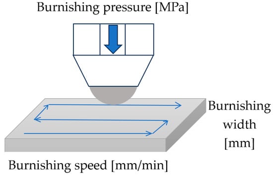 The samples after milling M1 and M2 and after grinding G1 were burnished using the Haas CNC Vertical Mill Center VF-1. Ball burnishing tests were conducted using the Ecoroll (Ecoroll AG Werkzeugtechnik, Celle, Germany) burnishing system. This system consists of a high-pressure pump and a burnishing tool 6 mm in diameter, which are connected via pressure hoses. The pressure was provided by a hydraulic pump. When the tool is fed along with the workpiece, the ball is pressed against the workpiece, resulting in the burnishing operation, and rolling friction contact occurs. The force of burnishing can be controlled by varying the hydraulic pressure of the fluid. Table 3 lists the burnishing parameters. They were selected on the basis of previous investigations of the author of this paper. The burnishing speed was constant because its effect on surface texture is small. Burnishing pressure p and width w (Figure 1) were input variables. They covered all the possible ranges of parameters possible to obtain using burnishing equipment.