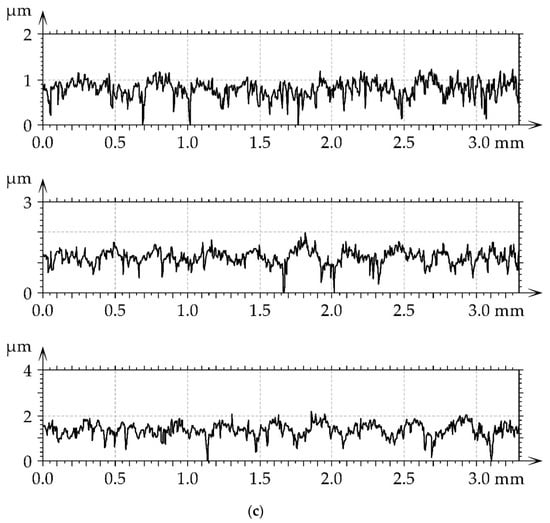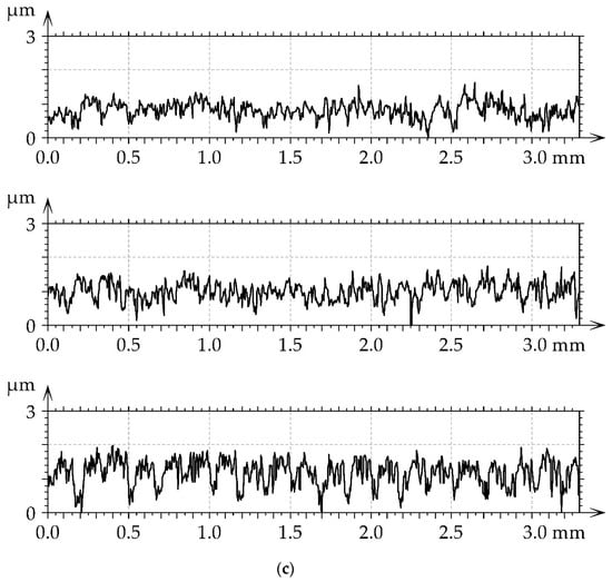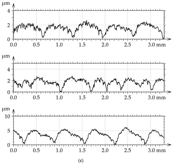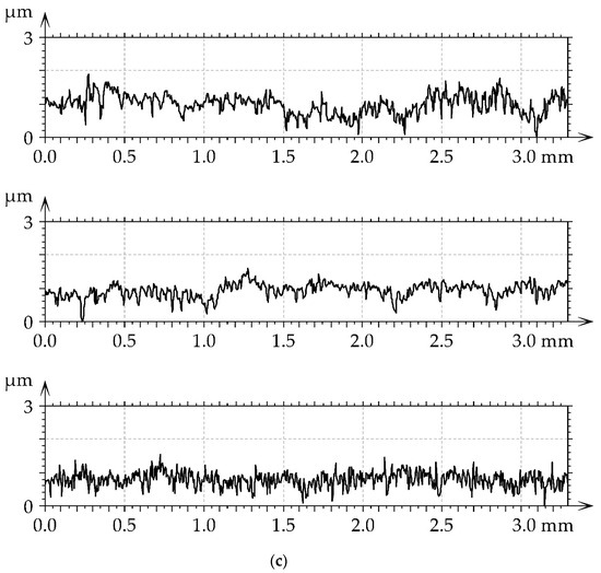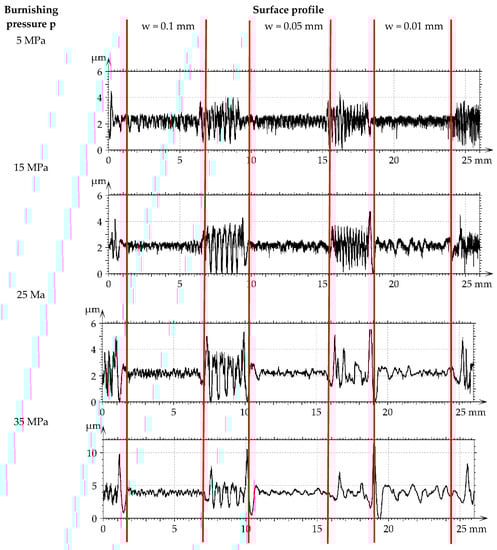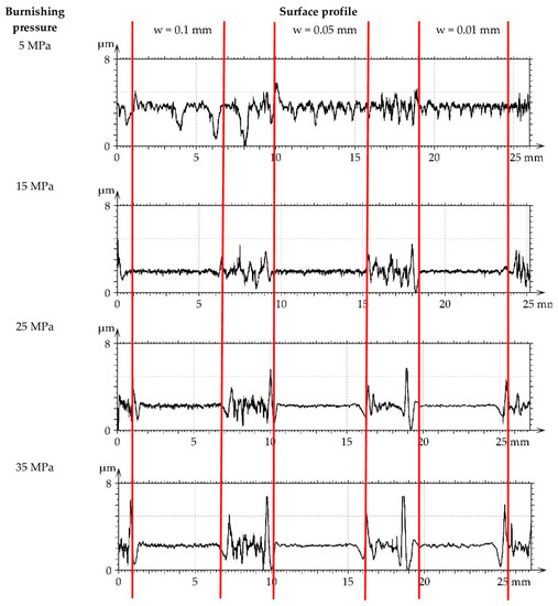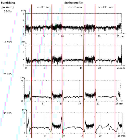Figure 7 presents roughness profiles performed through milled M1 and burnished samples. They were shown for direct comparison of surfaces after various treatments. A decrease in the roughness height of burnished surfaces can be observed with an increase in the burnishing pressure.