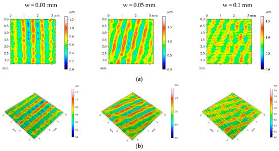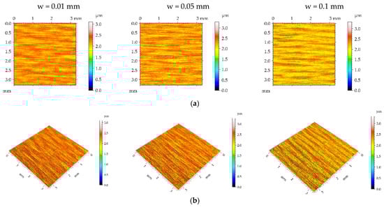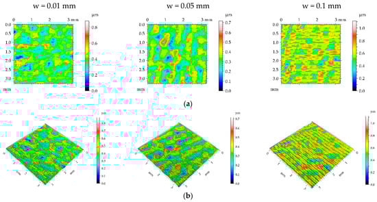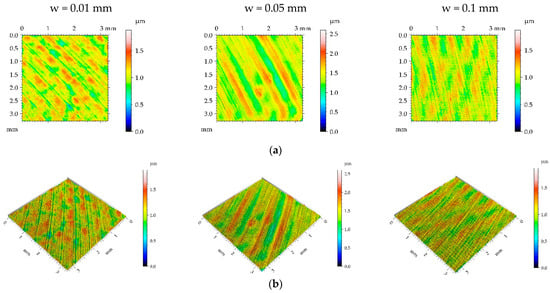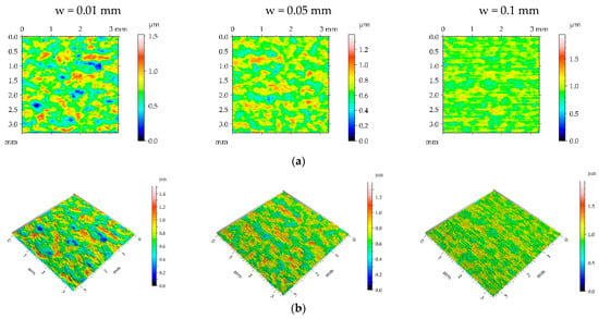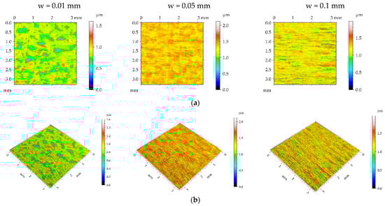 Pseudo-color images (a), 3D views (b), and profiles (c) of the M2 surface after burnishing surfaces with pressure p of 35 MPa and burnishing width w of 0.01 mm, 0.05 mm, and 0.1 mm, respectively.