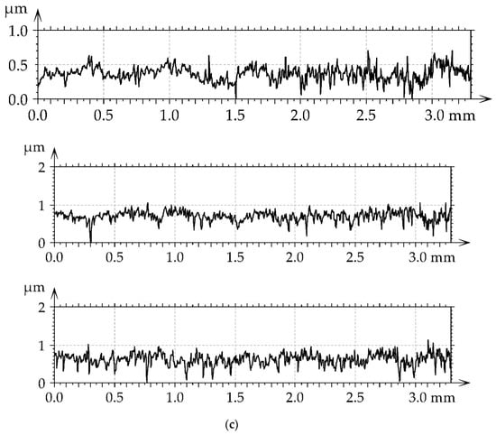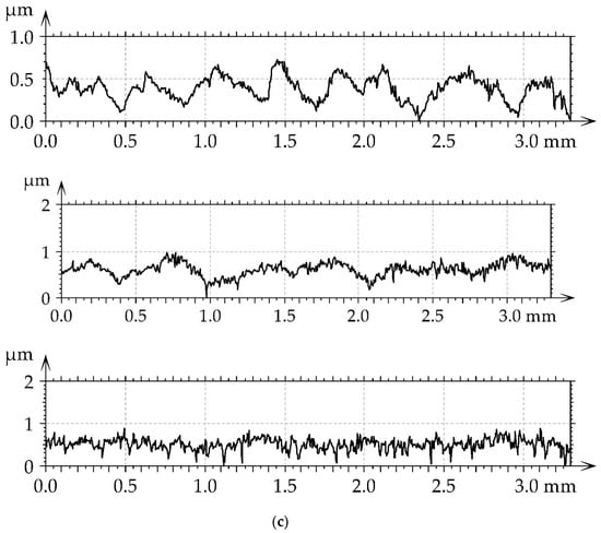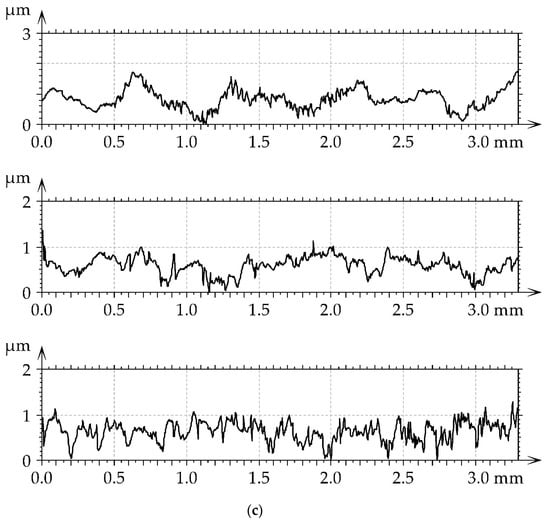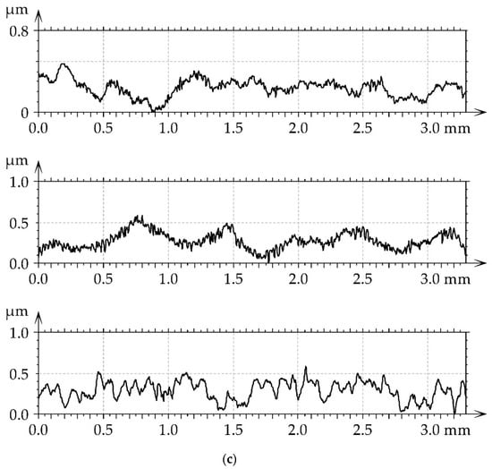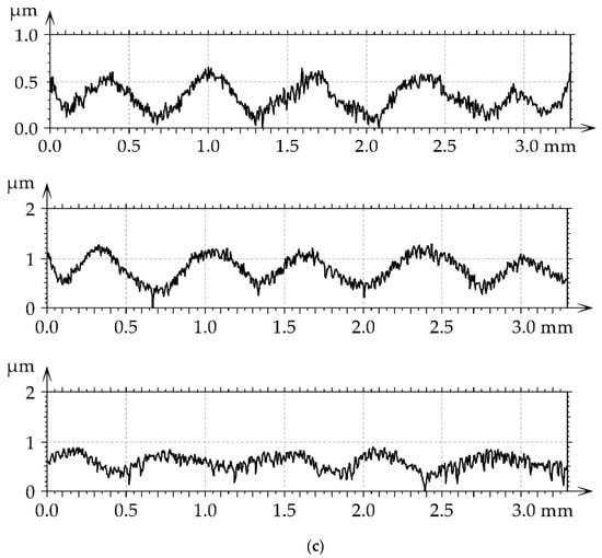 Figure 19 presents the roughness profiles performed for the surfaces after grinding G1 and burnished samples. A reduction in surface height due to ball burnishing is visible. Due to burnishing, the roughness height decreased. This reduction depends on the initial surface texture before burnishing. It was the highest when the height of the machined texture was the biggest. The final average surface amplitudes of the initial surfaces M1 and G1 subjected to burnishing were similar, and the resulting smallest values of the Sq parameter were near 0.1 µm. However, burnishing of the M2 surface led to the minimum values of the Sq parameter near 0.22 µm. The smoother final amplitude of the burnished M1 surface compared to M2 may be caused by smaller values of the spatial parameters Str and Sal of the M2 surface compared to the M1 surface. The plastic deformation of the M1 surface was likely easier than that of the M2 surface. The possibility of obtaining a smoother surface due to burnishing is important because in [24,34,37], the lowest roughness height led to the smallest friction and wear.