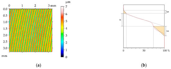 Surface topography substantially affects the functional properties of machine elements, such as contact between surfaces, sealing, friction, and wear [1,2,3]. The influence of surface texture on wear is important during running-in when accommodation between sliding surfaces occurs. However, this effect can also be maintained in a further period of machine part use. Previously, the behavior of the surface was analyzed on the basis of the parameters of roughness profiles [4]. However, the analysis of profiles can sometimes be insufficient [5]. Recently, an assessment of surface roughness was carried out based on the analysis of the results of areal (3D) surface topography [6,7]. Special parameters were developed for the analysis of the functional significance of the areal surface texture [8,9]. The analysis of areal surface texture is now very common in research, particularly after the development of efficient optical methods with a short measurement time [10]. Therefore, the researchers analyzed surface textures obtained after burnishing.