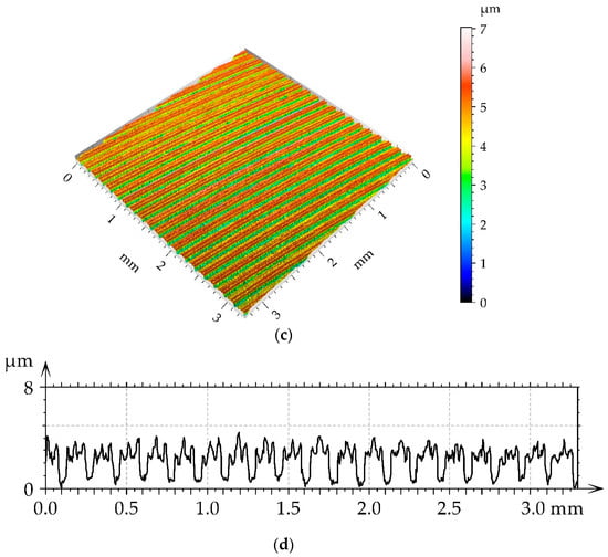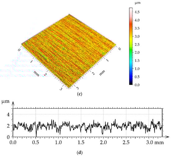 Figure 14 presents the contour plot, isometric view, material ratio curve, and selected profile of the example of the surface texture of the ground sample G1. This anisotropic surface had a random character, which is evident after analysis of the material ratio curve. The skewness Ssk is negative, which is a characteristic feature of the surface after grinding [3]. The roughness height, determined by the Sq parameter, is 0.417 µm.