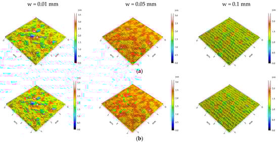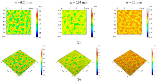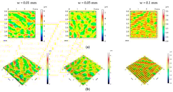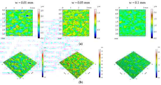 When the burnishing pressure p increased to 25 MPa, the surface height was slightly higher compared to that obtained at a pressure of 15 MPa (Figure 17 and Table 6). The surface texture was the most similar to the initial texture obtained after grinding when the burnishing width was the largest; in this case, the increases in the spatial parameters were the smallest. These parameters increased more for a smaller burnishing width. Hybrid parameters and the Spc parameter decreased due to burnishing, the highest reduction occurred for the smallest burnishing width, and the reduction in Spd reached 98%. The peak density increased for the largest burnishing width due to the large content of the high-frequency random component; for other burnishing widths, the peak density decreased due to burnishing.