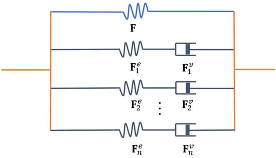 where is a function introduced to map an arbitrary material point inside into a spatial point inside and is the gradient operator with respect to the coordinates . To describe the viscoelasticity of DE at finite deformation, a one-dimensional analogy rheological model [22,25,30,31,32] is employed, as shown in Figure 1. Here, DE is assumed to comprise of a ground elastic network, with deformation gradient , and parallel viscous subnetworks, with elastic deformation gradient and viscous deformation gradient , resulting in the following relation: