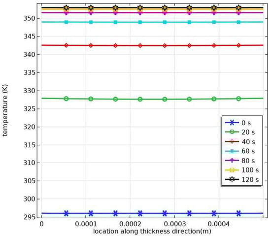 The heat conduction inside VHB4905 samples can be simplified as a one-dimensional problem since the dimension in the thickness direction is much smaller than the other two lateral dimensions, which results in negligible convective heat transfer on the lateral surfaces. By solving Equation (50) with the boundary condition (51) and the initial condition (52) through the commercial software COMSOL Multiphysic 5.3, the temperature distribution along the thickness direction during heating is obtained and shown in Figure 2. It can be seen that the temperature along thickness direction is nearly uniform and increases with time until it reaches (the temperature in the thermal chamber). This is because the great heat conductivity of VHB4905 leads to rapid heat transfer across a small distance between neighboring surfaces (0.5 mm), and forced gas convection between the sample and the air in the thermal chamber results in a steady temperature distribution after about 100 s. The numerical results reveal that 10 min is sufficient for VHB4905 samples to induce the temperature of the thermal chamber.