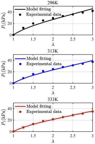 A comparison of the equilibrium stress-stretch relations at 296 K, 313 K, and 333 K from the model fitting and the experimental data [21].