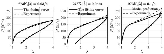 Figure 5 gives a comparison of the experimental data with the model fitting and the model prediction at different stretching rates and a fixed temperature of 273 K. We have found that results in well-converged results as well as physically realistic parameter values. With and () determined, the non-equilibrium modulus and the relaxation time are obtained by fitting Equations (57) and (59) with the experimental data at stretching rates and in Figure 5. Then, the model prediction of by using all determined parameters agrees well with the experimental data, and each loading-unloading cycle shows typical viscoelastic behavior, which validates the employed viscoelastic model.