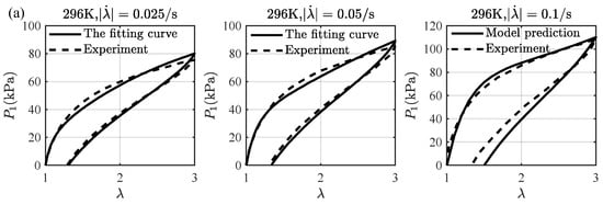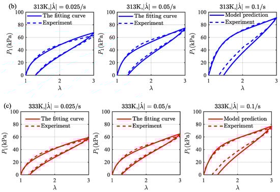 A comparison of the loading-unloading curves at (a) 296 K, (b) 313 K, and (c) 333 K. The experimental data of the stretching rate and are used for the model fitting, and is used for the model validation. The experimental data are taken from Mehnert et al. [21].