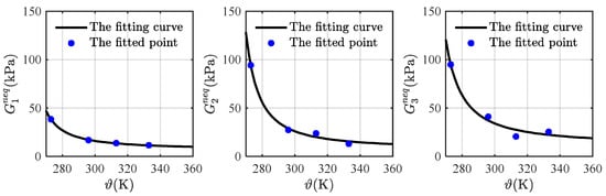 Figure 6 also presents a comparison of the experimental data with the model fitting and the model prediction at different stretching rates and temperatures. Here, we assume that the relaxation times and the extension limits are temperature-independent, so that only the dependence of the non-equilibrium moduli on temperature is obtained via the model fitting. The experimental data at the stretching rates and are used to determine the non-equilibrium moduli, and is used to validate the model fitting. It can be seen that the results from the model fitting and the model prediction are close to the experimental data, and the viscoelastic effect at the higher temperature is more significant, indicating that the strategy is reasonable. We assume that the dependence of the non-equilibrium moduli on temperature is also a WLF type like Equation (61) and fit this type with the obtained four discrete points, yielding the following fitting functions: