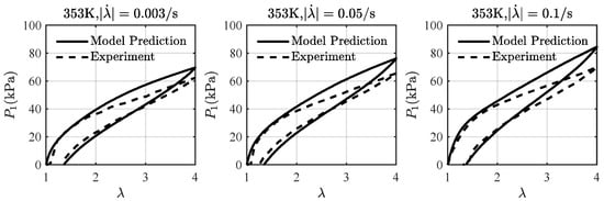The fitting curves of the non-equilibrium modulus versus temperature and the corresponding fitted points are depicted in Figure 7, where the fitting curves match roughly with these points. With these assumptions and relations, all parameters at 353 K (see Table 2) are obtained and substituted into Equations (57) and (59) for predicting the loading-unloading curves at different stretching rates.
