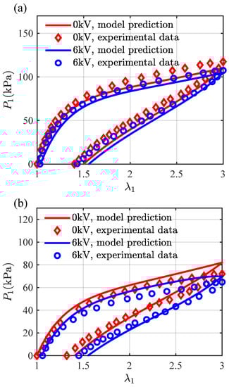 Furthermore, an electric field prior to the mechanical test leads to an extension of the sample in the transverse direction, so we have and with being the free stretch in the thickness direction after the application of an electric field. The electric field in the sample is considered to reach a steady and uniform state quickly once the electric potential difference between the two largest surfaces is applied. Thus, the electric field can be calculated as , where and are respectively the electric potential difference and the thickness of the VHB4905 sample. Because the relaxation times of the 1st, 2nd, and 3rd subnetworks are, respectively, 413.32 s, 5.43 s, and 1.65 s, we assume that the 1st subnetwork is completely elastic and the 2nd and 3rd subnetworks are completely viscous prior to the mechanical test. Therefore, using in the case of free expansion, Equation (65) can be reduced to the following: