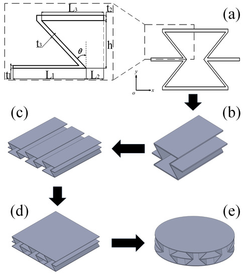 The geometric configuration of the re-entrant NPR sandwich structure configuration discussed in this paper is shown in Figure 1a. The unit cell of the re-entrant NPR sandwich structure is composed of ribs; the length of the ribs is L1, the thickness of the ribs is t1, the distance between the ribs and the center of the unit cell is L2, the thickness of the upper and lower walls is t2, the length of the upper and lower walls is L3, the thickness of the side walls is t3, and the distance from the center of the cell to the upper and lower sides, and the distance from the wall, is h. For the re-entrant NPR sandwich structure, where each unit cell is connected by a rib plate, the dimensions of each unit cell are the same. Figure 1b is a sandwich structure unit cell. Figure 1d shows the combination of the upper and lower walls of multiple unit cells with the upper and lower panels to form a complete sandwich structure. Figure 1e is a sandwich structure with a radius of 50 mm, cut out to match the experimental conditions.