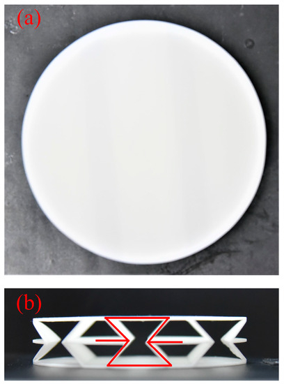 Figure 1 shows the construction flow chart of the sandwich structure. Considering the factors of the experimental equipment, the manufacturing size of the specimens is set as a cylinder with a radius of 50 mm. The corresponding experimental specimens were manufactured through 3D additive manufacturing technology (the machine model is China Taiwan ZRapid Tech Company Zhongrui SL660), and the material used in this additive manufacturing is photosensitive resin DSM8000. Table 1 shows the geometric parameters of the printed sandwich structure. The three-dimensional model diagram and the physical diagram are shown in Figure 1e and Figure 2.