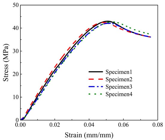 In order to obtain material performance data, a tensile test was carried out on the photosensitive resin material constituting the sandwich structure. In this tensile test, a universal mechanical testing machine (Instron Corporation, Boston, MA, USA model: INSTRON 3343) and an electronic extensometer (Instron Corporation, Boston, MA, USA model: Instron STATIC) were used. The tensile speed of the testing machine was controlled at 2 mm/min, and the test standard was the ISO37-2017 standard. Table 2 shows the geometric parameters of the specimen structure of this tensile test, the experimental shape is shown on the right side of Figure 3b. The geometric parameters of the tensile specimen are: overall length A, width of ends B, length of narrow portion C, width of narrow portion D, transition radius outside E, transition radius inside F and tensile test piece thickness t *. In order to reduce experimental errors, the specimens used in this tensile test and the sandwich structure specimens were fabricated together by the same machine. The diagram of the specimens and the experimental process are shown in Figure 3. Figure 4 is the stress–strain curve corresponding to the Young’s modulus of each specimen measured in this experiment. Table 3 shows the mass and Young’s modulus of each of the test pieces. The average Young’s modulus Es of the sandwich structure material measured in this test is 1040.65 MPa, Poisson’s ratio v is measured as 0.2, and the material density ρm is calculated as 1.157 g/cm3. We will use these data in subsequent finite element simulations.