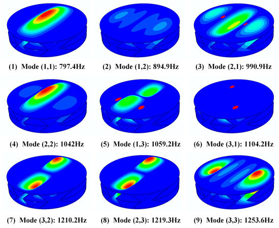 The first nine natural frequencies of the sandwich structure were obtained through numerical simulation using the finite element analysis software ABAQUS 6.13. Resonance occurs when the frequency of an incident sound wave matches the natural frequency of a material. In sound insulation applications, this may cause the energy of sound waves to travel through the material more easily, thereby reducing the sound insulation effect. In addition, the resonance may also induce vibrations within the material itself, generating noise which further impacts the sound insulation performance. Table 4 shows the resonant frequencies corresponding to the first 9 modes of the sandwich structure, and Figure 5 shows the cloud diagram of the force corresponding to the 9 modes. When the direction and frequency of the incident sound wave corresponds to the vibration mode of the mode, this will cause the resonance of the sandwich structure, thereby generating a sound insulation valley. We will compare and analyze the natural frequency of the sandwich structure obtained through simulation with the subsequent acoustic simulation results.