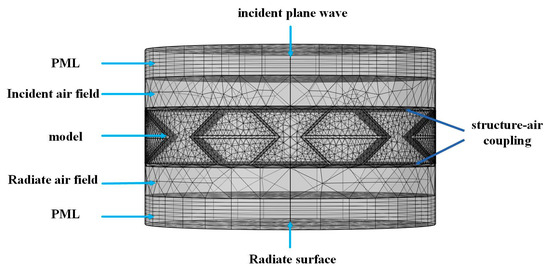 As shown in Figure 6, the corresponding model is established in the finite element software COMOL Multiphysics 5.4, and uses the two modules “Pressure Acoustics” and “Solid Mechanics”. Import the established 3D model of the sandwich structure into the software of COMOL Multiphysics, establish the incident air field and radiate air field, Perfectly Matched Layers (PML), set the corresponding material parameters and configuration parameters, and divide the mesh. The sound wave is incident on the radiation surface in the form of plane waves from the front end of the incident air field, passes through the radiate air field, and radiates completely in the form of Perfectly Matched Layers. Simulate the conditions of the sandwich structures in acoustic impedance tubes. The edge of the plate is set as a free boundary, the sound pressure of the incident sound wave is set to 1 Pa, the sound velocity is 343 m/s, the air density is 1.29 kg/m3, the sandwich structure is vertically incident in the form of a plane wave, and the frequency band of the incident sound wave is 250–1600 Hz.