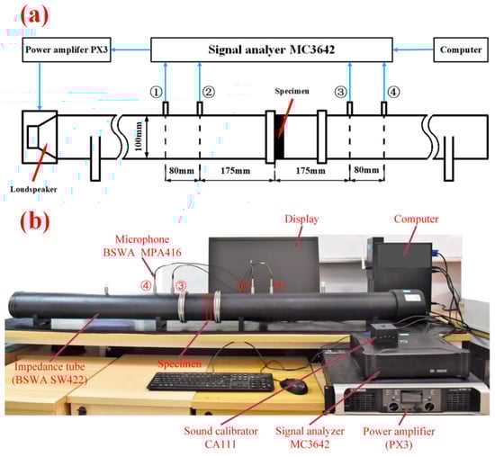 The schematic diagrams of the acoustic impedance tube test method and the actual test equipment are shown in Figure 7a and Figure 7b, respectively. The computer software can control the signal analyzer (China Beijing BSWA TECH Company machine Model: MC 3642) to generate parallel sound waves, which are amplified by the power amplifier (China Beijing BSWA TECH Company machine Model: PX3) within the frequency power of 200–1600 Hz. Sound is output from the speaker of the acoustic impedance tube (China Beijing BSWA TECH Company machine Model: SW422) into the tube. Then, the signal analyzer uses 4 microphones (China Beijing BSWA TECH Company machine Model: MPA416) to collect the sound signal, and the microphones transmit it to the computer software for processing in order to obtain the STL value of the sandwich structure.