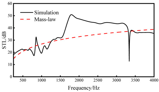 Given that the primary noise frequency bands of high-speed trains tend to concentrate within the range of 250–4000 Hz [1,3], the frequency detection range for this research is set accordingly. Figure 9 illustrates that the average sound transmission loss within the frequency range of 250–4000 Hz achieved a substantial value of 36.0 dB. Notably, this result indicates a pronounced suppression effect in the noise frequency band (1000–4000 Hz), which corresponds to the range that the human ear is particularly sensitive to. Compared with the average sound insulation of the quality theorem in the same frequency range of 31.7 dB, it is 4.3 dB higher, and, especially in the frequency range of 1655–2405 Hz, the sound transmission loss of this sandwich structure is more than 10 dB higher than the sound transmission loss of the mass theorem at the same frequency. It shows that the re-entrant NPR sandwich structure is better than the solid structure with the same volume within the research range. Therefore, the re-entrant NPR sandwich structure realizes the functions of being light weight and having high sound transmission loss performance.