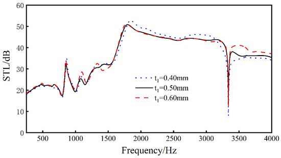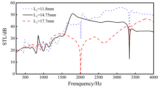 Change the thickness L1 of the ribs, and analyze the sound transmission loss of the sandwich structure when L1 = 11.8 mm, L1 = 14.75 mm, and L1 = 17.7 mm.