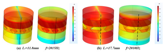 Increasing the length L1 of the ribs will have a greater impact on the sound transmission loss effect of the sandwich structure. As shown in Figure 11, when the length of the ribs increases, the distance between the unit cells in the sandwich structure will increase, and the space above and below the ribs of the unit cells will increase. At the same time, the sound insulation of the sandwich structure in the middle and high frequency range (1500–4000 Hz) decreases with the increase in the rib length, and the overall sound insulation gradually decreases. For the frequency band below 1500 Hz, the sound insulation trend is relatively flat with the increase in the rib length, and the overall sound insulation does not change much. In addition, when the rib length is 11.8 mm and 17.7 mm, both of them produce a new sound insulation valley at 2010 Hz. It can be seen from Figure 12 that, under the same condition of L1, when the side ribs of the re-entrant NPR sandwich structure are located at the center of the circle, as shown in Figure 12a, a corresponding sound insulation trough will be generated. When the ribs are not in the center of the circle, as shown in Figure 12b, the acoustic valleys disappear. It can be seen from the figure that the reason for the sound insulation valley is that the circular structure used in the finite element simulation and the re-entrant NPR sandwich structure produces phase interference at the corresponding frequency, resulting in the sound insulation valley.