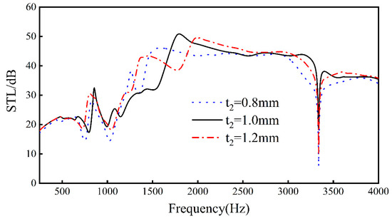 Keeping L1, L2, L3, L4, t1, t3, h, and Ex unchanged, by changing the thickness t2 of the rib, analyze the change of sound transmission loss when t2 = 0.8 mm, t2 = 1.0 mm, and t2 = 1.2 mm. The results can be seen in the Figure 13 below.