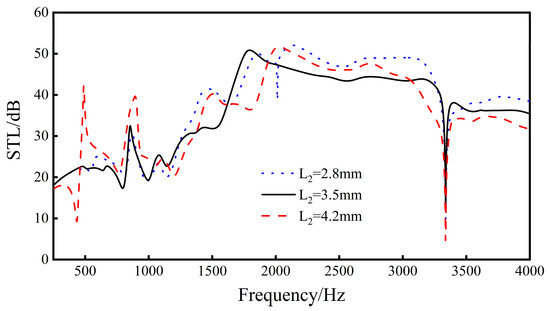 Change the thickness L2 of the ribs, and analyze the re-entrant NPR sound transmission loss of the sandwich structure when L2 = 2.8 mm, L2 = 3.5 mm, and L2 = 4.2 mm.