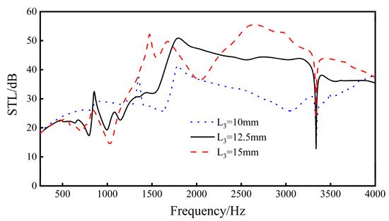It can be seen from the Figure 15 that, when the length L3 of the upper and lower walls increases, the distance between the two sides of the sandwich structure unit cell increases, the volume of the internal cavity of the unit cell increases, the overall sound transmission loss of the structure increases, and the sound insulation wave peak moves to high frequency. The longer the length of the upper and lower walls, the greater the fluctuation of the sound insulation curve of the sandwich structure, especially in the middle and high-end frequency bands (1500–4000 Hz).