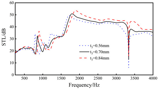 As can be seen from Figure 10, changing the thickness of the ribs of the sandwich structure within a certain range will hardly change the sound transmission loss curve of the structure, indicating that the change of the thickness of the ribs will not have a great impact on the sound insulation of the sandwich structure.