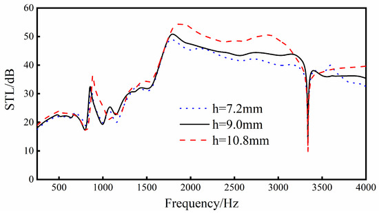 Therefore, we can draw a conclusion: when the thickness of the upper and lower walls increases, in the 250–4000 Hz frequency band, the overall sound insulation will first increase and then decrease with the increase in thickness, and the sound insulation peak will move to high frequency, increasing from the trough to the peak, and then trend will gradually slow down. In engineering applications, when it is necessary to reduce noise at a specific frequency, the sound insulation peak can be moved to this frequency by adjusting the upper and lower wall thicknesses, or the maximum overall sound insulation of the sandwich structure can be obtained through optimization.
