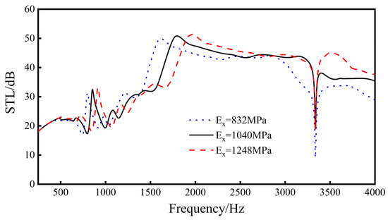 It can be seen from Figure 18 that, with the increase in Young’s modulus, the overall sound transmission loss of the sandwich structure increases. For every 20% increase in Young’s modulus, the average sound insulation of the sandwich structure in the 250–4000 Hz frequency range increases by about 1 dB. At the same time, for every 20% increase in Young’s modulus, the natural frequencies of the 1st, 3rd, and 6th orders (the first three sound insulation valleys) of the sandwich structure increase by 50, 70 and 110 Hz, respectively, and the frequencies of the two sound insulation peaks increase by 60 and 160 Hz, respectively. In addition, the increase in Young’s modulus has a significantly higher impact on the sound transmission loss performance of the sandwich structure in the frequency range of 1500 to 4000 Hz than in the frequency range of 250–1500 Hz.