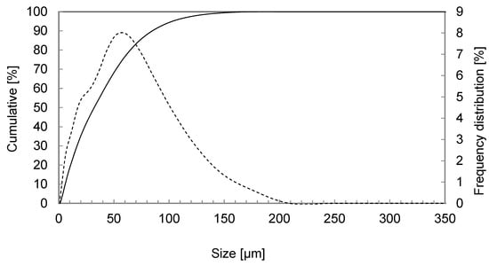 Chalcopyrite concentrates for the tests were obtained from a Chilean mining company. Figure 1 displays the particle-size distribution of chalcopyrite concentrates, which is 100% below a size of 296.0 µm (100%—#50) and P80 = 60.66 µm. The particle-size distribution was determined using laser diffraction Microtrac S3500 (Microtrac, York, PA, USA).