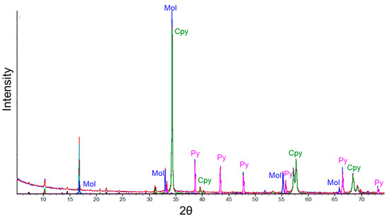 XRD of chalcopyrite concentrates (Cpy = chalcopyrite; Py = piryte; Mol = molibdenyte).