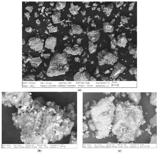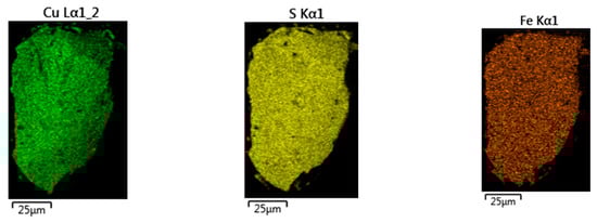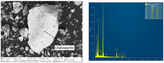 Furthermore, Figure 3 presents a microphotograph obtained with scanning electron microscopy (SEM) analysis using Zeiss EVO MA10 model equipment (CARL ZEISS Ltd., Oberkochen, Germany) and an energy-dispersive X-ray analyzer (EDS) on a point of the concentrates at 647× magnification (OXFORD Instruments, Oxford, UK). According to this analysis, it can be observed that the chalcopyrite particles do not exhibit a high specific surface area or a high BET content (Brunauer, Emmett, and Teller), as rough particles are not prominently visible.