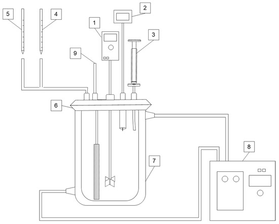 The schematic diagram of the leaching setup: 1. overhead stirrer; 2. pH and ORP probe; 3. sampling tube, equipped with syringe and syringe filter; 4. H2SO4; 5. oxidant; 6. sealed lid; 7. jacketed reactor; 8. water bath; 9. air pump with sponge filter.