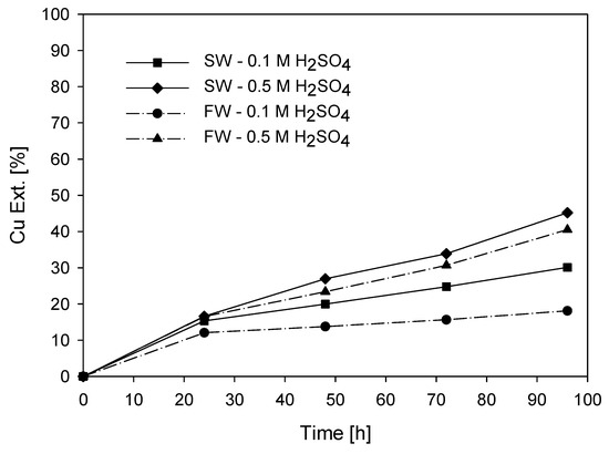 According to Figure 5, the extraction curves after 40 h show favorable extraction when the system incorporates chloride ions from seawater. Leaching is more effective with chloride due to its higher kinetic rate of electron transfer [21,22,41,42]. In addition to the effect of chloride ion addition, acid plays an important role in leaching systems. As shown in the previous figure, higher acidity concentration results in higher extraction. In these experiments, the effect of increasing acid concentration by 40 times is greater (0.1 and 0.5 M) than the effect of increasing chloride concentration by 19 times (between 0 and 19 g/L). At low acid concentrations (0.1 M), copper extraction is more favorable with the integration of chloride ions from seawater, resulting in a 12% increase compared with tests at higher acid concentrations (0.5 M), where the increase is only 3%.