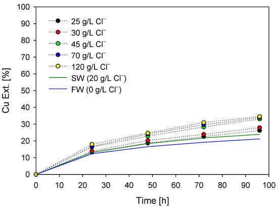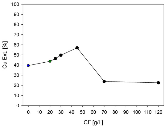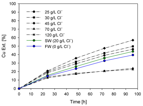 According to the results, an increase in chloride concentration leads to an increase in copper dissolution from the concentrates, with an optimal value being observed at 45 g/L Cl− (which corresponds to the 20 g/L Cl− from seawater and an additional 25 g/L Cl−). Furthermore, it can be observed that copper dissolution with 70 g/L and 120 g/L Cl− does not show a substantial change at the end of the test.