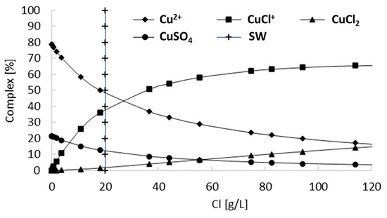 Speciation curve of Cu2+ chloride complexes at 25 °C. Conditions: pH = 5 and 0.131 mM of Cu2+. Modified from Chesne and Kim [47].