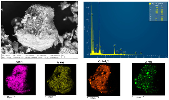 SEM and EDS microanalyses of a leached chalcopyrite particle with addition of Cl− at a concentration of 120 g/L. Conditions: 100 ppm of KI, 45 °C, 50 g of sample with 1000 mL of seawater solution, stirring rate of 450 rpm.