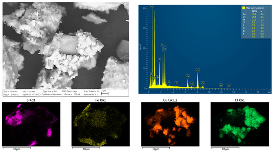 The particles of chalcopyrite were investigated using SEM and EDS analyses (see Figure 10 and Figure 11) to visualize the porosity on the surface area to understand the effect of chloride ion presence on the surface properties of the residue, as well as the precipitation of chloride salts on the surface of chalcopyrite grains. These salts correspond to cuprous chloride (CuCl) according to the thermodynamic analysis of reactions (1), (5), and (11), which coincides with a typical cubic crystal structure of cuprous chloride. According to these images, the formation of precipitates is more pronounced, as observed in the SEM analysis, when higher concentrations of chloride are present in the solution. It can be observed that the surface area and porosity of the residue are greater in the presence of a higher concentration of chloride ions, in contrast to the original concentrates shown in Figure 3. Greater porosity facilitates the diffusion of reactants and products to and from the reaction sites. SEM analysis reveals that chloride ions promote the formation of porous layers of elemental sulfur on the mineral surfaces, thereby enhancing the extraction of Cu.