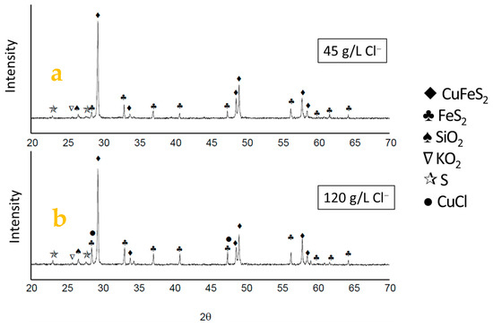 The leached residues from the samples using 45 g/L and 120 g/L chloride ions were analyzed using XRD, as shown in Figure 12. XRD was performed on these two samples as they exhibited the highest copper extraction and were the ones where chloride had a limited effect on leaching. An increase in the intensity of pyrite peaks is observed with the addition of 25 to 100 g/L chloride to the solution, along with the presence of the crystalline phase of CuCl in the sample with the highest chloride concentration, which is confirmed by the SEM-EDS analyses and the above speciation curve, indicating the precipitation of this salt on the grain surfaces. The presence of another oxidizing agent could prevent the precipitation of CuCl. Similarly, XRD revealed the presence of elemental sulfur in both residues.