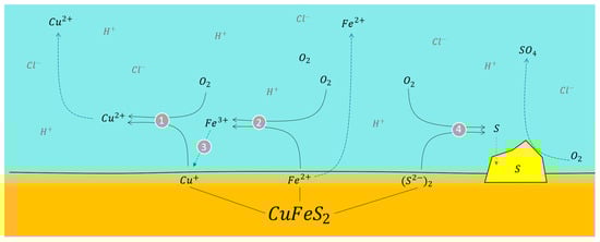 Schematization of the reaction between oxygen and chalcopyrite ore in an acidic environment. Conditions: 100 ppm of KI, 45 °C, 50 g of sample with 1000 mL of seawater solution, stirring rate of 450 rpm.