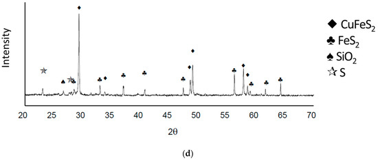 To assess the surface characteristics of the leached mineral, an SEM analysis was performed on the tailings with the use of air and 0.5 M H2SO4. The objective was to observe any potential alterations in the morphology or texture of the concentrate grains. The findings of this analysis are overall depicted in Figure 15. Initially, Figure 15a presents an image of the tailings at a magnification of 300×, offering an perspective. Notably, the particles exhibit sponge-like precipitates on their surfaces. Figure 15b,c provide a more detailed examination of the chalcopyrite grain morphology and their response to the introduction of air. Based on the XRD analysis presented in Figure 15d, it can be observed that the layer formed on the chalcopyrite particles is composed of elemental sulfur. No other mineral phases were detected in the analysis. Since there were no significant oxidative conditions present to generate SO42−, the addition of air to the solution resulted in the formation of a crystalline sulfur layer. This aligns with the mechanism proposed by Mojtahedi, Rasouli [48], which is consistent with the results proposed in the present study. Therefore, in an aerated system with oxygen, reactions (13) and (15) were the oxidation reactions for the initial and subsequent stages of chalcopyrite mineral, consistently with previous studies [29,52,53].