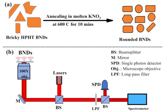 Crushed boron-doped nanodiamonds (BNDs), ~0.5 wt% of boron, with average size of 100 nm used in this study were purchased from Adamas Nanotechnologies, Raleigh, NC, USA. To clean the surface of the purchased BNDs and smoothen their sharp edges to rounded, we used a well-known molten potassium nitrate (KNO3) treatment at a high temperature of 600 °C for 10 min as illustrated in Figure 1a [26,27]. For cleaning BNDs in potassium nitrate, 2 mg (corresponds to 400 µL of 5 mg/mL BNDs in DI water) of BNDs sample was mixed with 1 g of KNO3 powder and then mixed very well in an agate mortar. The homogeneous mixture was placed in a quartz boat and placed in a Thermolyne 21100 tube furnace and annealed at 600 °C for 10 min. The sample was then cooled down to room temperature, dissolved in water, and centrifuged. The pellet was resuspended in 2 mL of water, sonicated for 10 s in an ultrasonic bath, and centrifuged again. This washing step was repeated five times to completely remove salt residue. After that, the cleaned BNDs solution was placed in a glass vial and stored for further use. After appropriate cleaning of the BNDs, size, morphology, x-ray diffraction (XRD), and Raman measurements of the treated BNDs were performed to ensure that the cleaned NDs retain their structural and optical properties.