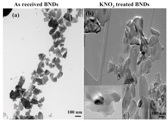 (a) TEM image of as-received BNDs shows uncleaned surfaces, irregular shapes, and sharp edges of BNDs. The average size of the received BNDs can be estimated from the TEM image to be in order of 100 nm. (b) The KNO3-treated BNDs illustrate clean surface and round-shaped crystals with average size of less than 100 nm. ((b), inset) shows a zoomed image of clean surface and rounded BNDs.