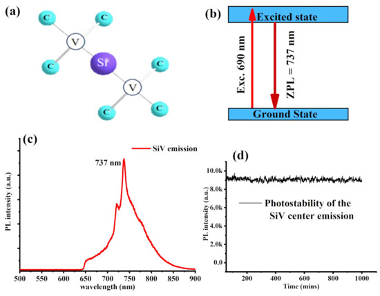 Next, after cleaning and smoothing of the morphology of the BNDs, we decided to create silicon vacancies in the treated BNDs and test their optical performance prior to quantum temperature sensing experiment. The negatively charged SiV center in diamond is a point defect formed by the replacement of two adjacent carbon atoms with a single silicon atom as illustrated in Figure 4a. Upon a biocompatible laser excitation (mostly 690 nm), the SiV color center in diamond crystal emits a bright, narrowband, optical transition peaked at 737 nm (called the zero-phonon line ZPL) between its ground and excited states as illustrated in Figure 4b [17,19]. To experimentally create SiV color centers in the treated BNDs, appropriated ion implantation with silicon atoms at an implantation energy of 50 keV and doses of 2 × 1014 ion/cm2 was carried out followed by a required post-annealing in vacuum at 1100 °C for two hours in order to mobilize the created vacancies to form SiV center complex in the cleaned BNDs. Upon 690 nm laser excitation, the optical emission of the silicon-implanted BNDs showed a strong and narrow SiV center emission with its strong ZPL peaked at 737 nm, as shown in Figure 4c, which was in good agreement with SiV center emission observed in bulk diamonds implanted with silicon atoms [17,19]. The photostability of the detected optical emission from the SiV center was performed and revealed a stable emission over a thousand minuets under a continuous laser illumination. The density of SiV color centers within the BNDs nanocrystals are expected to be almost equal to the ion implantation dose density.