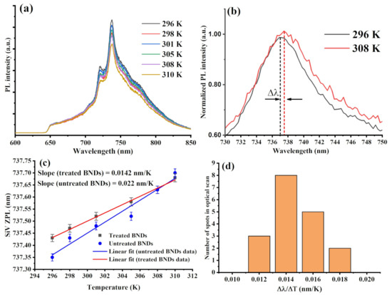 To explain the physics behind using SiV center in diamond in thermometry, the photoluminescence (PL) spectrum of the SiV reveals a strong peak at 737 nm at room temperature as shown in Figure 5a. This peak shifts with temperature due to the phonon mixing of the excited state [18]. Similar behavior of other color centers in diamond such as tin-vacancy (SnV) and germanium-vacancy (GeV) color centers was reported in the literature [18,25,34]. The observed ZPL shift of the SiV center as a function of temperature can be attributed to the electron–phonon interaction and is much faster than the spontaneous decay rate of the exited state over a wide range of temperatures, resulting in a strong temperature dependence of both the line width of the transition and a shift of its spectral position [18].