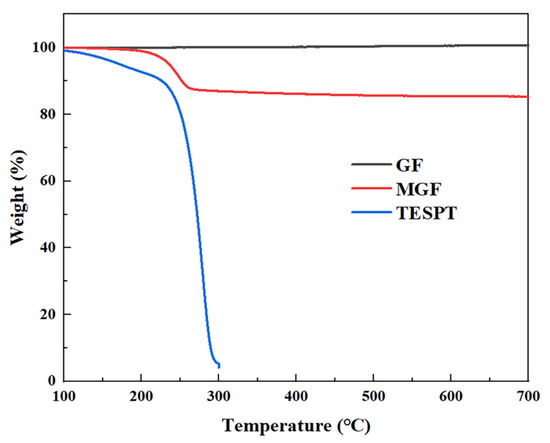 In order to quantitatively characterize the grafting rate of MGF, cut the GF and MGF samples after drying, weigh about 5 mg of each sample, and measure them in the thermogravimetric analyzer (TGA/DSC1/1600, METTLER TOLEDO, Columbus, OH, USA). The test temperature starts at 30 °C; control the heating rate of 10 °C/min, and raise it to 900 °C under a flow rate of 100 mL/min N2. For the TESPT samples after drying, weigh about 5 mg of each sample, and measure them in the thermogravimetric analyzer; the test temperature starts at 30 °C. Control the heating rate of 10 °C/min, and raise to 300 °C under a flow rate of 100 mL/min N2.