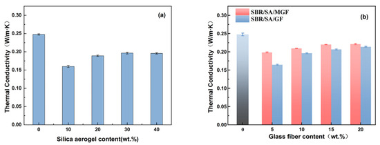 Figure 3 displays the thermal conductivity of rubber composites containing SBR/SA, SBR/SA/GF, and SBR/SA/MGF. It can be observed that the thermal conductivity of pure SBR rubber is 0.2476 W/(m·K). When the mass of SA is 10 wt% of SBR, the thermal conductivity (λ) is 0.1597 W/(m·K). Halim et al. [23] demonstrated that the addition of 9 wt% SA to silicone rubber (SiR) reduced the λ value by 0.18 W/(m·K). Fini Bidgoli et al. [24] added the same mass fraction of nano-SiO2 and SA into a nitrile-butadiene rubber (NBR) matrix and found that the thermal conductivity of the composites decreased by 15% and 43%, respectively, due to the unique nanoscale porous structure of SA. This structure can effectively reduce heat conduction through the solid, and each pore wall acts as a heat shield, blocking heat transfer and improving the thermal insulation performance of the composite material. Dispersibility also has a significant impact on the thermal conductivity of aerogel composites [25]. When the volume fraction of aerogel in the composite reaches a certain value, the aerogel particles aggregate, resulting in a clustered state [26]. The clustered state is known to be beneficial to thermal conductivity; thus, the thermal conductivity of composites increases with further increasing SA content. Hence, the results indicate that the addition of 10 wt% SA to the SBR composite yields the best thermal insulation performance. For the purposes of this study, the SA content remains constant at 10%, while the compounding ratio of GF is varied. The obtained SBR/SA/GF and SBR/SA/MGF rubber composites with varying contents’ thermal conductivity are shown in Figure 3b. The thermal conductivity of the composite is slightly increased but still significantly lower than that of pure SBR (0.2476 W/m·K). This indicates that the addition of GF to the composites promotes thermal network formation, which becomes more apparent with increasing fiber content [27,28,29]. However, it is worth noting that the thermal conductivity of the SBR/SA/MGF composite increases, compared to the addition of the same mass fraction of SBR/SA/GF [30]. The primary reason for this phenomenon is that the modified MGF has a good bridging effect with the matrix, which can reduce the void volume in the composite system, improve the contact surface between the fiber and the rubber, reduce the interfacial thermal resistance of the material, and establish a more comprehensive thermal conduction pathway.
