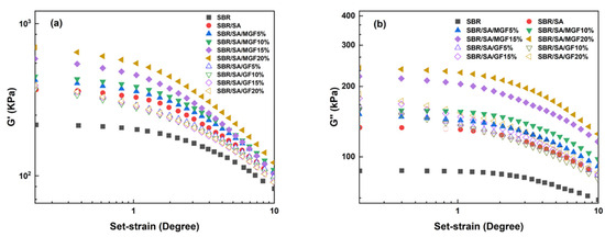 G′ (a) and G″ (b) as a function of γ for SBR rubber composites.