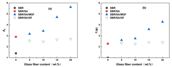 and the strain amplification factor change with the mass fraction of filler particles, as depicted in Figure 7a,b. When the content of GF is the same, the and of the SBR/SA/MGF compound are higher than those of the SBR/SA/GF compound, indicating that the reinforcing effect of MGF is better than that of GF [40,41].